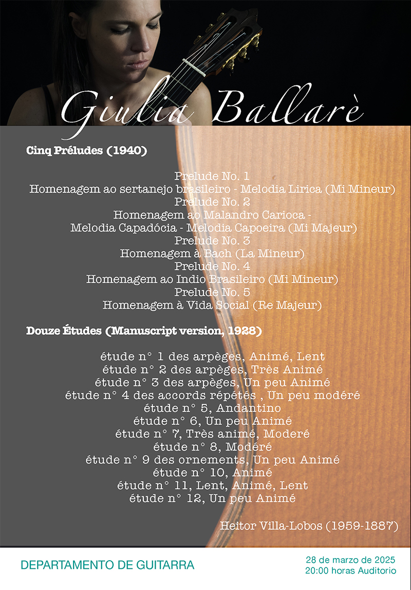 Giulia Ballaré (1987, Novara) está considerada unha das solistas italianas máis prometedoras da súa xeración. Comezou a tocar a guitarra aos nove anos e graduouse con matrícula de honra no Conservatorio Guido Cantelli de Novara co mestre Guido Fichtner en 2012. Recibiu clases maxistrais con figuras destacadas do mundo da guitarra clásica, como Oscar Ghiglia, David Russell, Pavel Steidl, Paolo Pegoraro, Marcin Dylla, Judicael Perroy, Aniello Desiderio e Adriano Del Sal.